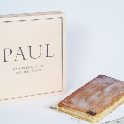 | Crujientes capas de masa hojaldre rellena de crema pastelera, decorada con fondant de vainilla |